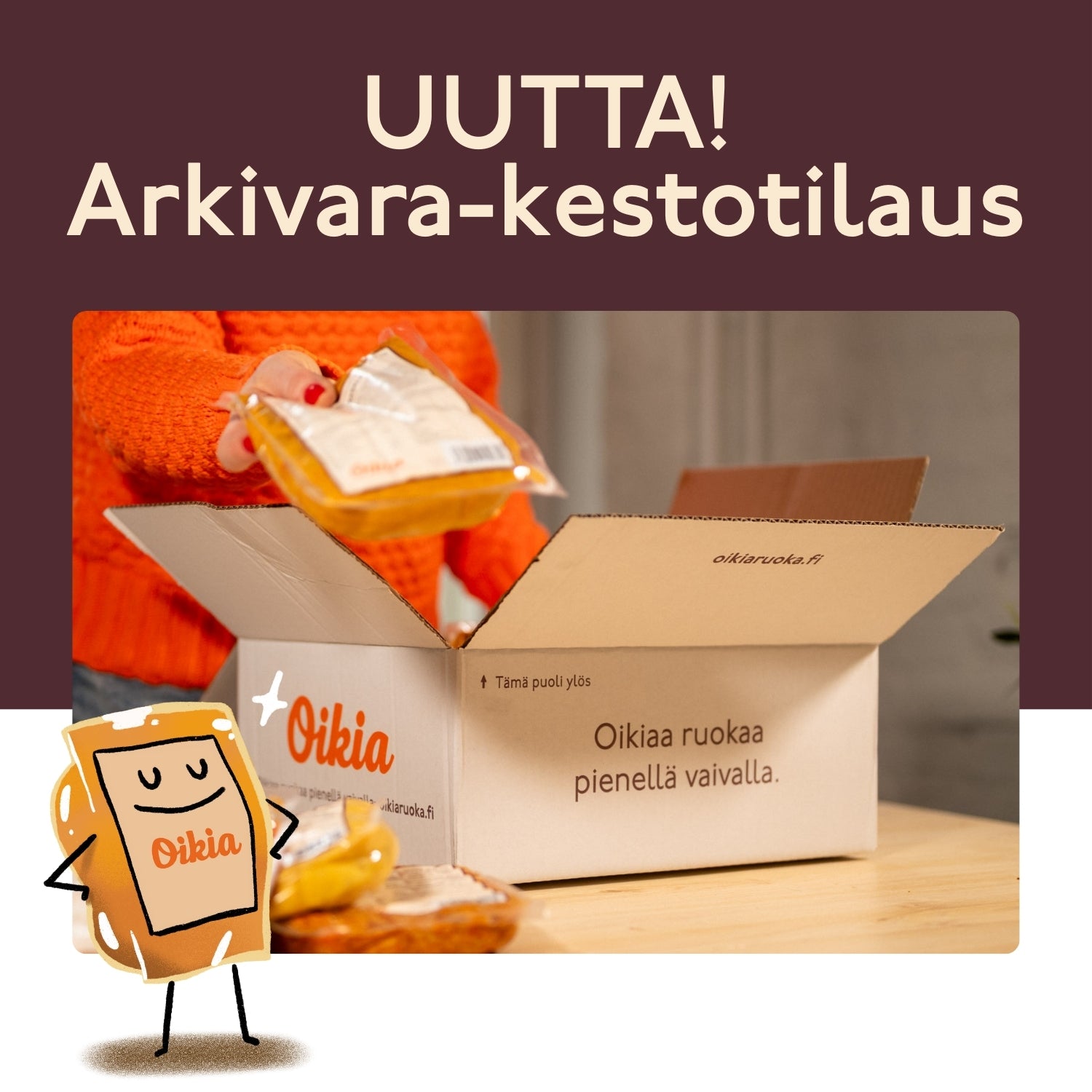 Oikia Ruoan Arkivara on jatkuva palvelu, jonka kautta saat joka kuukausi 8 ateriaa yhdessä boksissa suoraan kotiovellesi. Me valitsemme ateriat ja tuomme ne suoraan kotiovellesi.