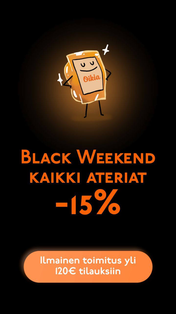 Black Weekendin tarjoukset ovat voimassa perjantaista maanantaihin 28.11.-1.12. ja koskee kaikkia normaalihintaisia aterioita.